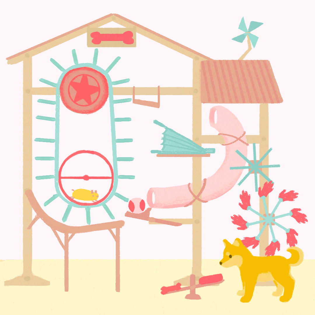 A puppy gets some pets in this looping Rube Goldberg-inspired gif.